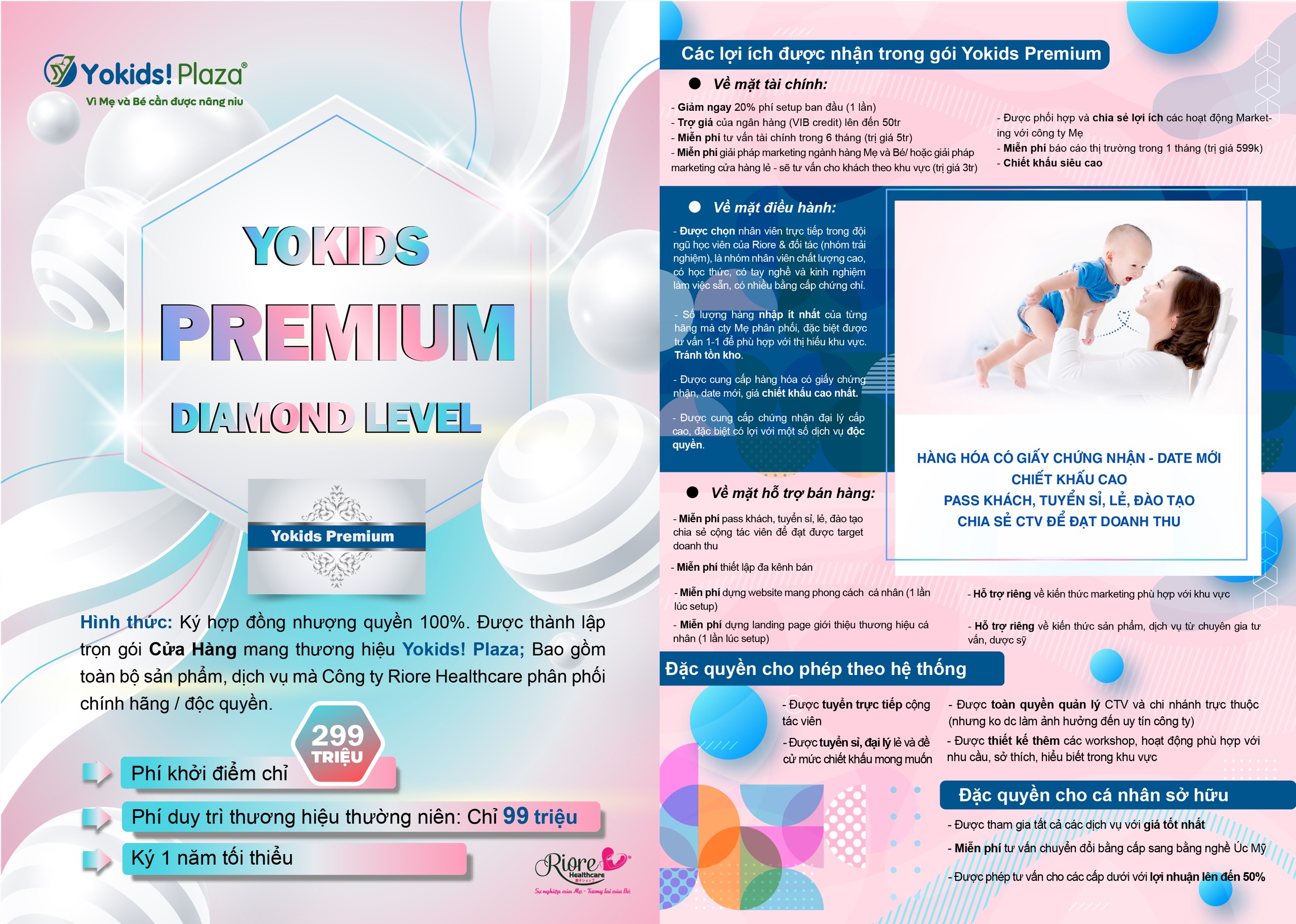 Hình thức: Ký hợp đồng nhượng quyền 100%. Được thành lập trọn gói Cửa Hàng mang thương hiệu Yokids! Plaza; Bao gồm toàn bộ sản phẩm, dịch vụ mà Công ty Riore Healthcare phân phối chính hãng/ độc quyền